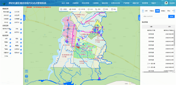 中水三立以GIS等技術(shù)為支持,通過試點(diǎn)一張圖整合了淠史杭灌區(qū)整體范圍、水系圖層和清涼寺試點(diǎn)的范圍、水系圖層,提供多種圖層疊加服務(wù),并對(duì)試點(diǎn)范圍內(nèi)的信息化設(shè)備數(shù)據(jù)進(jìn)行采集,以及數(shù)字灌區(qū)一期物聯(lián)網(wǎng)平臺(tái)的共享數(shù)據(jù),實(shí)現(xiàn)基礎(chǔ)信息、監(jiān)測(cè)信息等各類信息的展示、查詢和統(tǒng)計(jì),以及測(cè)控一體化閘門運(yùn)行狀態(tài)監(jiān)視及閘門實(shí)時(shí)在線控制等功能。