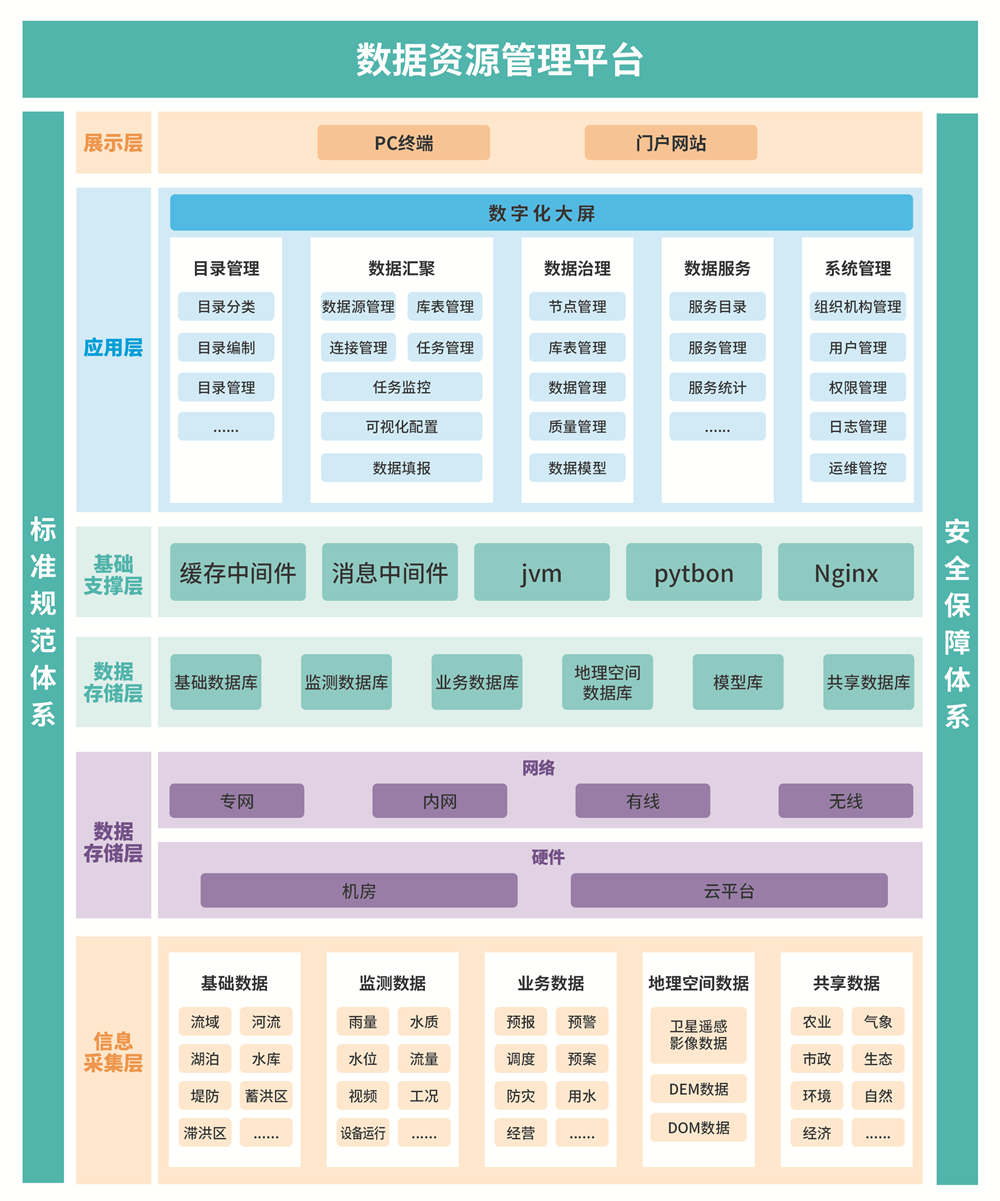 數(shù)據(jù)資源管理平臺(tái)通過(guò)對(duì)已建信息系統(tǒng)數(shù)據(jù)、人工填報(bào)數(shù)據(jù)、紙質(zhì)文檔數(shù)據(jù)、物聯(lián)網(wǎng)數(shù)據(jù)等數(shù)據(jù)的獲取,構(gòu)成數(shù)據(jù)源。同時(shí)對(duì)分散的多源異構(gòu)數(shù)據(jù)進(jìn)行治理,面向防洪調(diào)度、水資源管理與調(diào)配等業(yè)務(wù)需求,按照基礎(chǔ)數(shù)據(jù)、監(jiān)測(cè)數(shù)據(jù)、地理空間數(shù)據(jù)、業(yè)務(wù)數(shù)據(jù)、共享數(shù)據(jù)等進(jìn)行分類存儲(chǔ)。同步建立數(shù)據(jù)的更新、發(fā)布、共享等機(jī)制與功能,豐富數(shù)據(jù)內(nèi)容、提升數(shù)據(jù)質(zhì)量,為實(shí)現(xiàn)數(shù)據(jù)資源的集中管理和數(shù)據(jù)查詢、多維度分析、可視化應(yīng)用搭建數(shù)據(jù)基礎(chǔ)。數(shù)據(jù)資源管理平臺(tái)核心建設(shè)內(nèi)容主要包括數(shù)據(jù)匯聚、數(shù)據(jù)治理、數(shù)據(jù)服務(wù)、數(shù)據(jù)資源目錄。