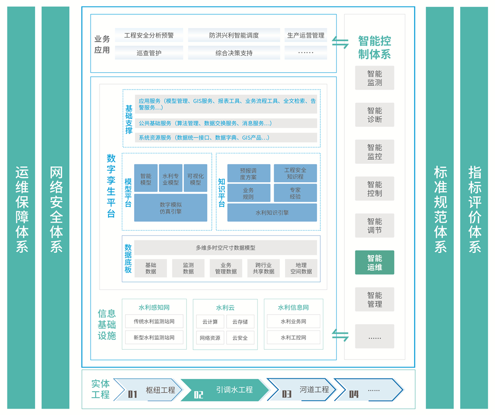 綜合運維管理平臺定位聚焦于標準化達標和智能化運維的雙重目標,旨在通過標準化管理體系與智能化技術手段的結(jié)合,全面提升水利工程的運維效率、安全性和可持續(xù)性。通過制定統(tǒng)一的運維流程、檔案存儲流程,確保水利設施的運行維護符合行業(yè)規(guī)范和安全要求;同時結(jié)合水利工程設施的多源數(shù)據(jù)、專家經(jīng)驗、運維規(guī)則等靜態(tài)知識,以及平臺運行過程中持續(xù)挖掘的動態(tài)知識,共同融入水利運維業(yè)務的全流程,實現(xiàn)以數(shù)據(jù)驅(qū)動的優(yōu)化運行、健康評估、巡檢規(guī)劃、遠程運維、預測性維護和決策推薦,最終構(gòu)建水利工程運維生態(tài),逐步推進運維管理向無人化、精準化、智慧化邁步。