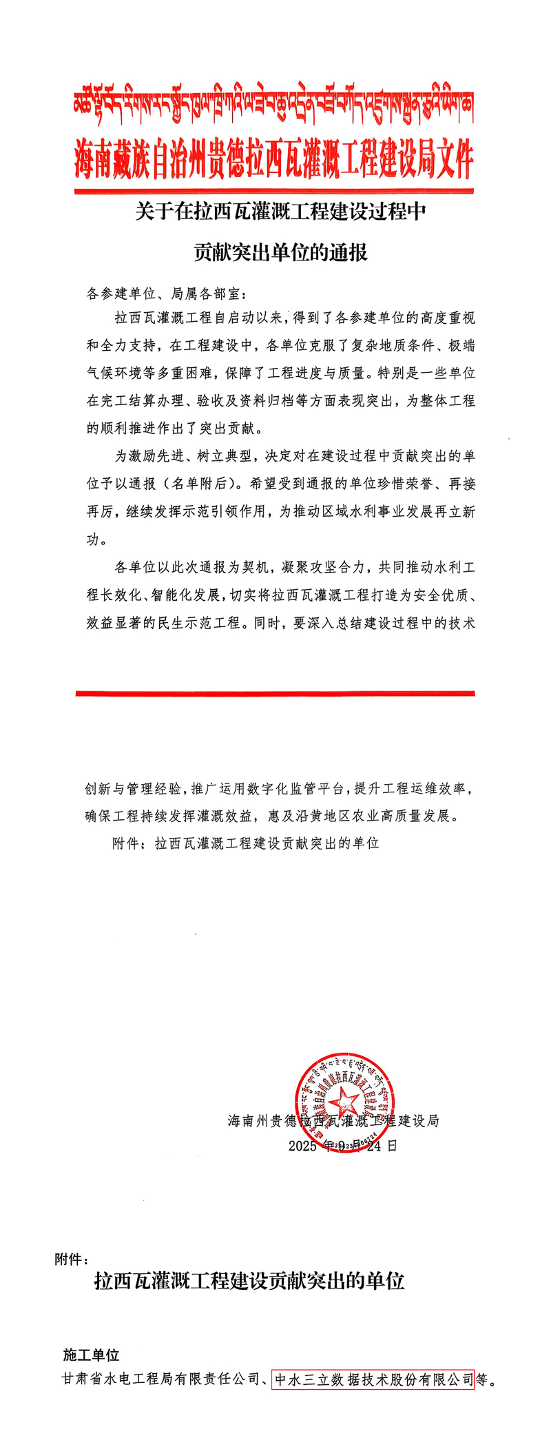 近日,中水三立在水利信息化領(lǐng)域捷報(bào)頻傳。公司承建的青海省貴德縣拉西瓦灌溉工程不僅如期兌現(xiàn)關(guān)鍵節(jié)點(diǎn)目標(biāo),更憑借高交付質(zhì)量與高效率運(yùn)管獲高度認(rèn)可,贏得業(yè)主表彰通報(bào)并給予現(xiàn)金激勵(lì)!