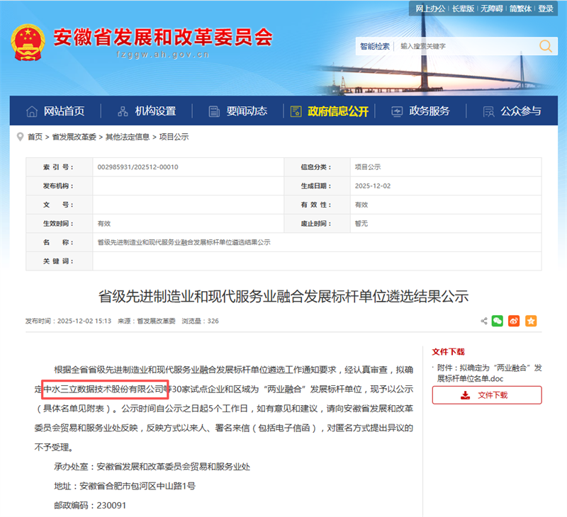 近日,安徽省發(fā)展和改革委員會正式公布省級先進制造業(yè)和現(xiàn)代服務(wù)業(yè)融合發(fā)展標桿單位遴選結(jié)果。中水三立憑借在“兩業(yè)融合”領(lǐng)域的扎實實踐與卓越成效成功上榜,成為全省涉水人工智能領(lǐng)域唯一入選的標桿企業(yè)!