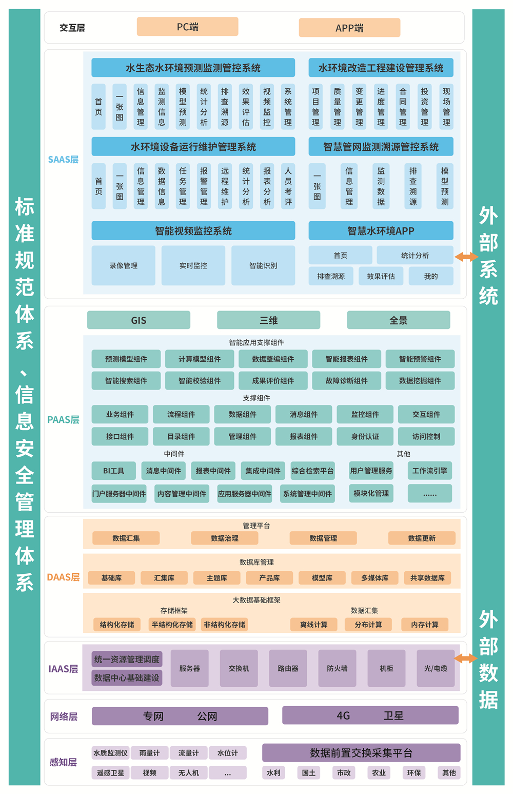 1)智慧水環(huán)境平臺根據(jù)三監(jiān)測、三結(jié)合、一控制和兩手抓的建設(shè)思路,緊密圍繞治理的水環(huán)境、水資源、水生態(tài)等三個方面實現(xiàn)流域水質(zhì)監(jiān)測、水量監(jiān)測和藍(lán)藻水華監(jiān)測;